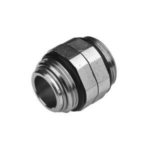 Dwustronny łącznik obrotowy GZ/GZ, do łączenia kolektorów układu mieszającego z belkami rozdzielacza lub szeregowego połączenia ze sobą rozdzielaczy w przypadku rozbudowy instalacji.