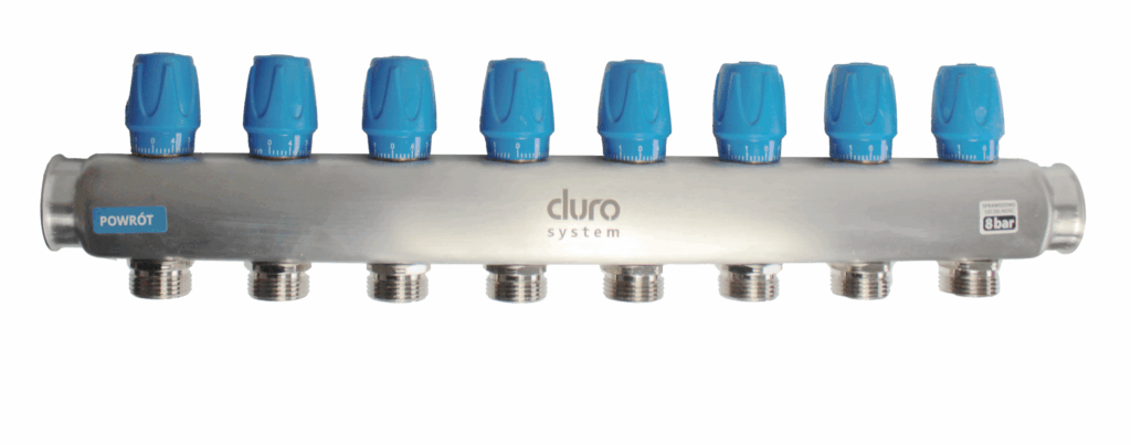 Belka do rozdzielacza z zaworami regulacyjnymi z pokrętłami niebieskimi