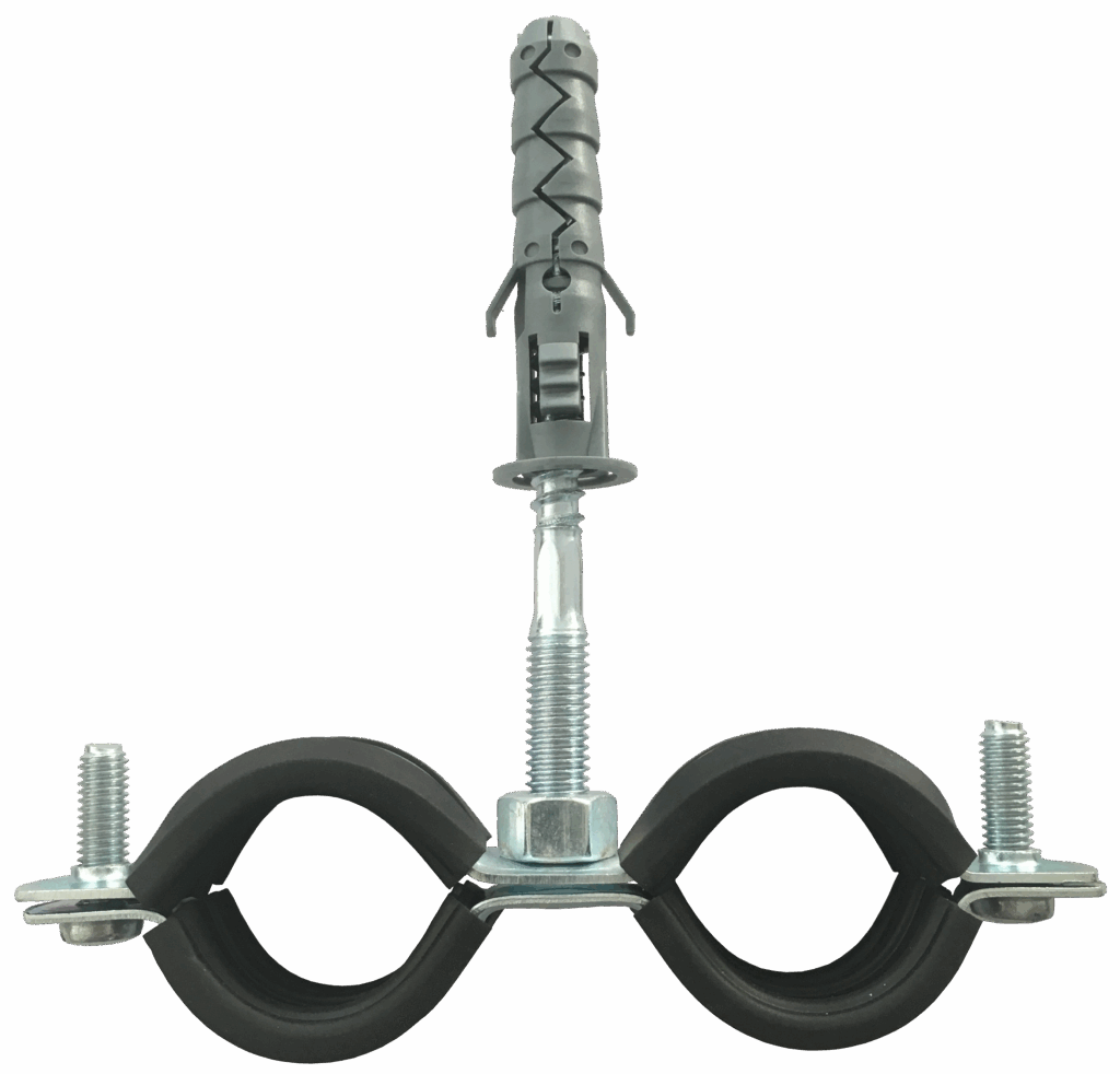 Obejma metalowa do rur, podwójna, do podwieszania przewodów instalacyjnych z rur wewnątrz i na zewnątrz pomieszczeń.
