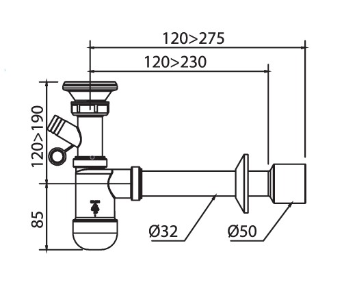 SYFON UMYWALKOWY BUTELKOWY FI 32/50 mm, PRZYŁĄCZE DO PRALKI, SITKO METALOWE, KOREK GUMOWY, RURA ODPŁYWOWA Z ROZETĄ