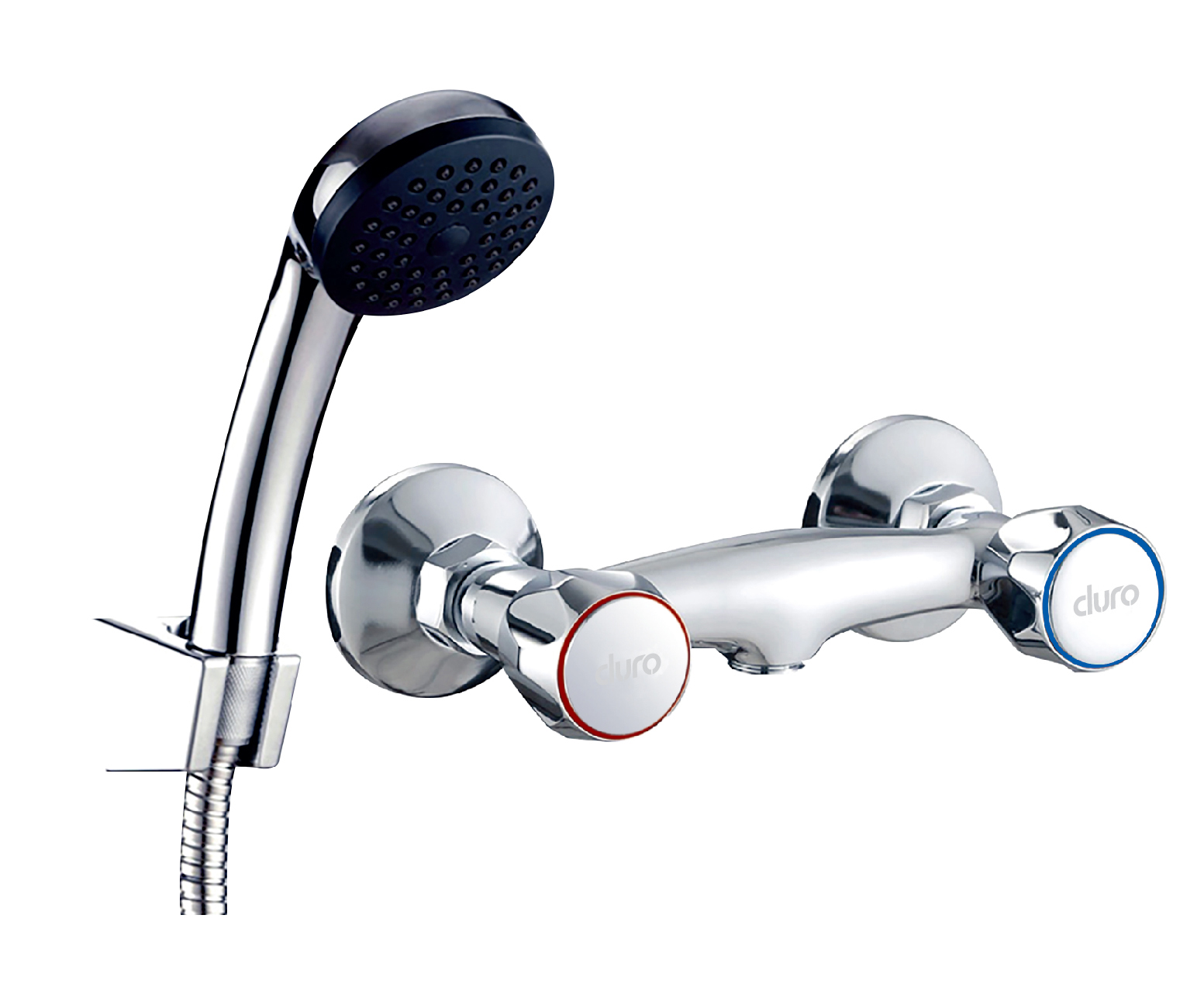 Bateria dwuuchwytowa, ścienna, bez wylewki, w komplecie słuchawka, wąż i uchwyt natryskowy. Klasa przepływu A, grupa akustyczna II.